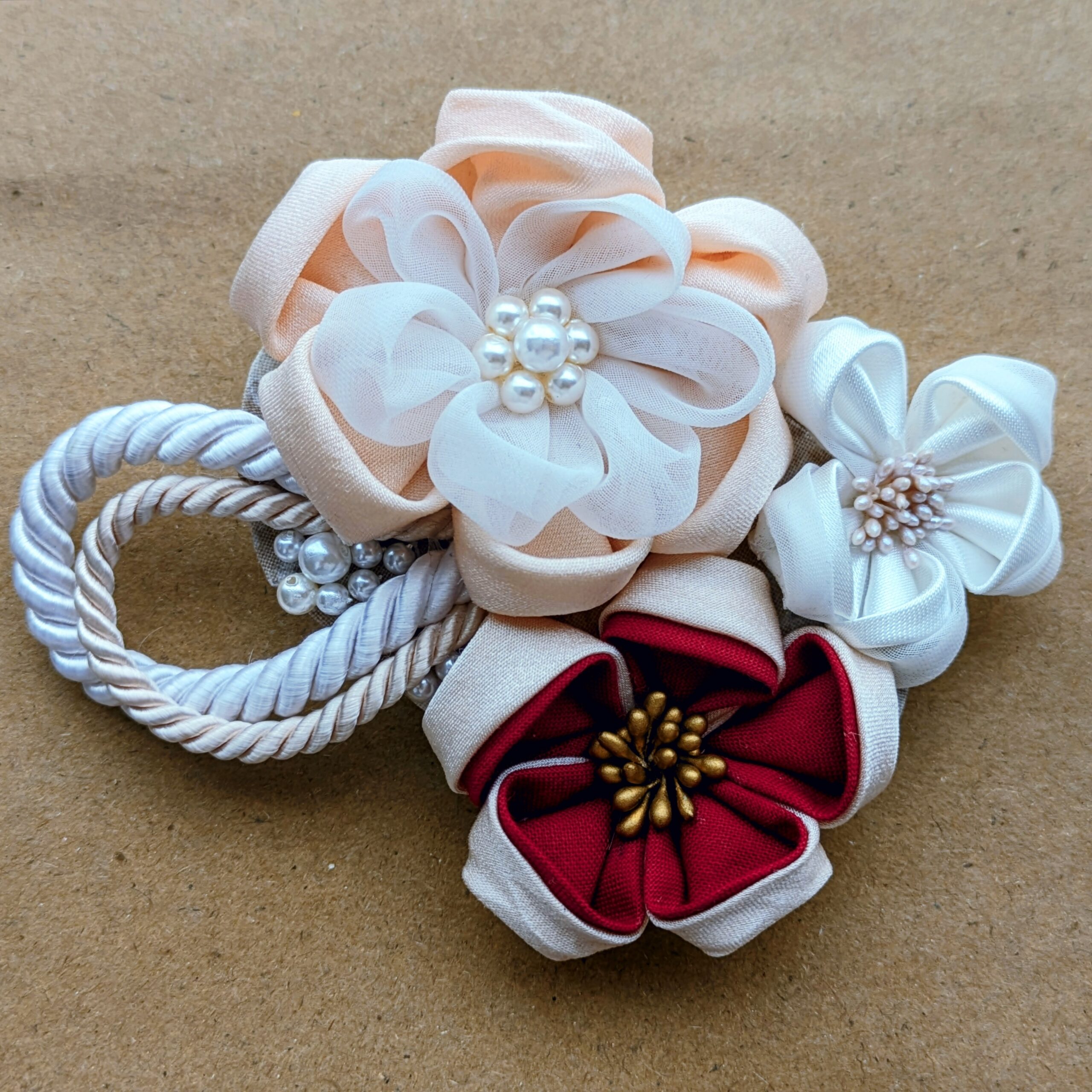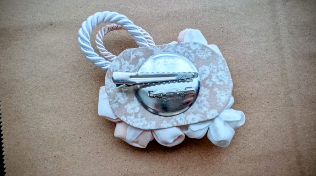 当時はモチーフを決める余裕もなく、基本の『丸つまみ』を組み合わせて、ヘアクリップに仕上げました。