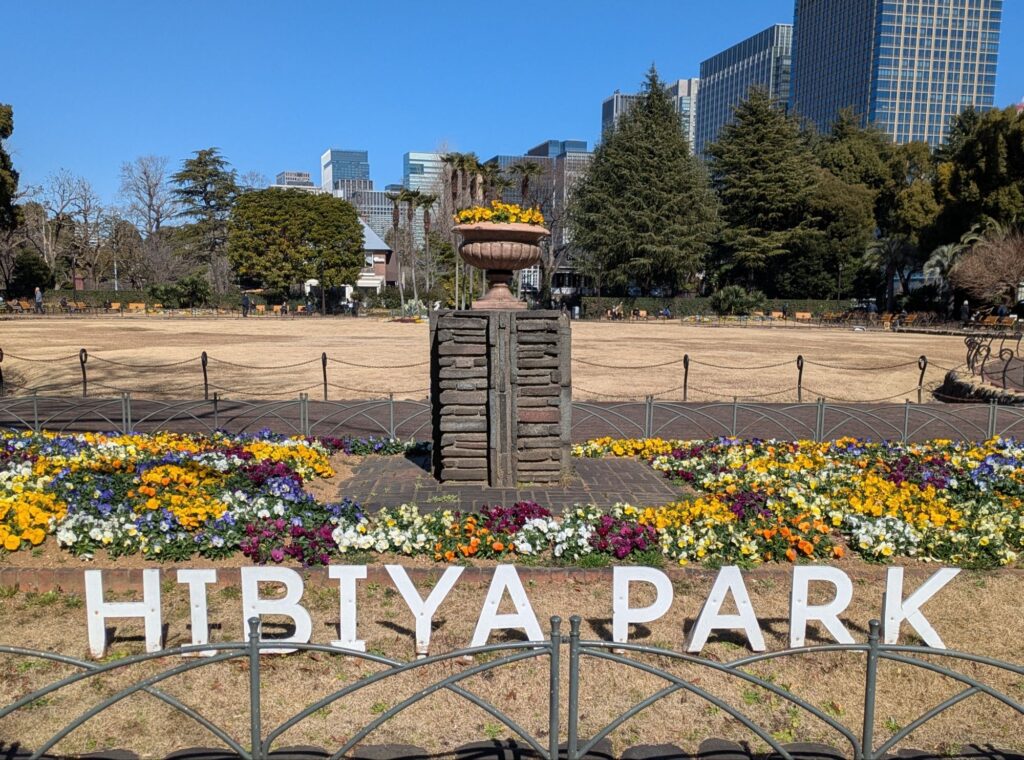 東京・日比谷公園で、冬の花壇を彩るパンジーとビオラが咲きほこっていました。